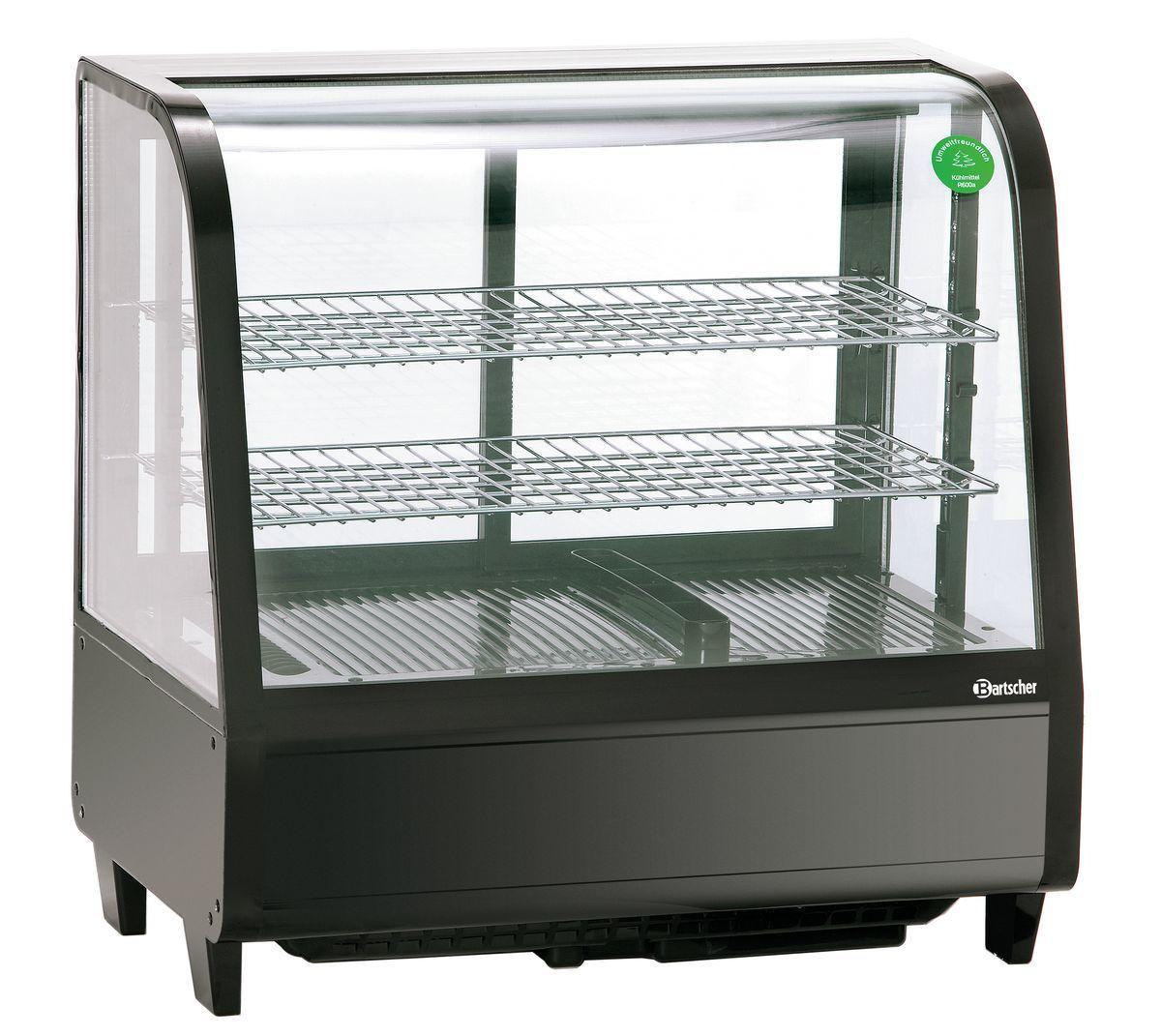 Deli-Cool I kjølt displaykabinett, 100 liter, 2–12 °C, svart, med LED-belysning. Heldekkende dobbeltglass med avrundet frontglass, to hyller, skyvedører på baksiden og tvungen luftsirkulasjon.