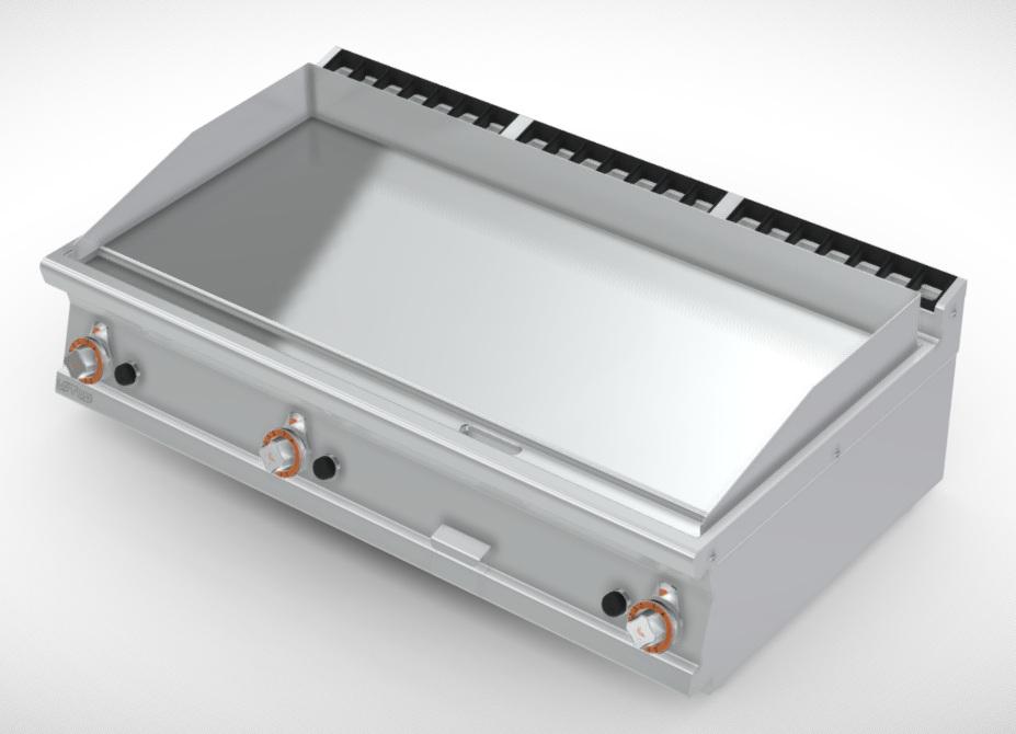 Gass drevet flatgrill utført i rustfritt stål med plan grillflate med Chrome finsish for mindre varmeavgivelse og enklere renhold.Chrome polert for "speil" finish.