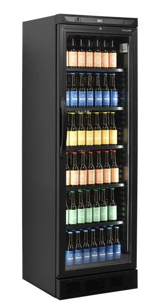 Mineralvannskjøleskap i sort med glassdør.